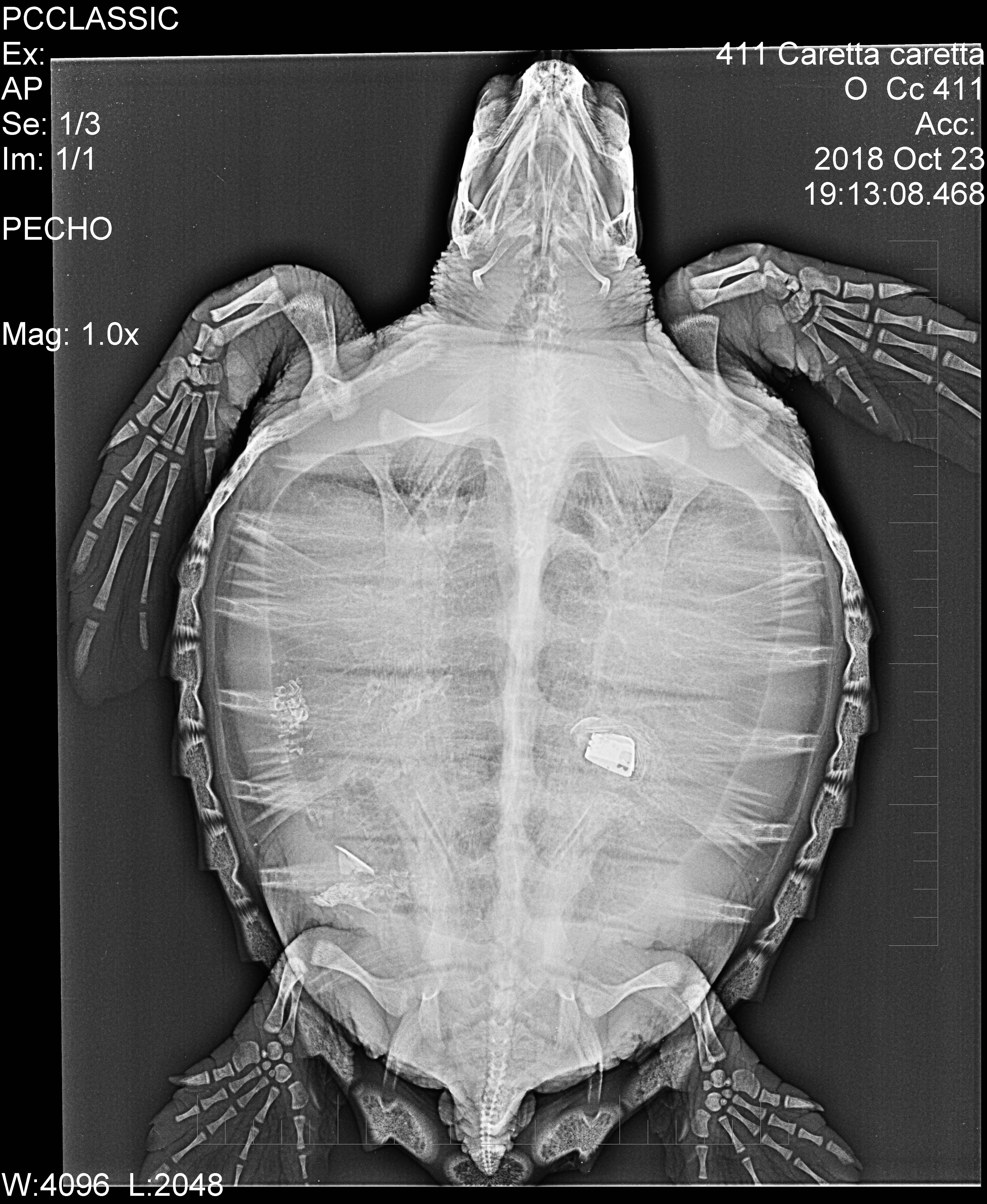 En el ARCA del Mar descubrieron que el quelonio, como tantos otros, sufría una embolia gaseosa leve por lo que fue introducida en la cámara hiperbárica para su recuperación. Pero dentro de los controles rutinarios se le hizo una radiografía y en ella se observó claramente el cabezal metálico de un mechero. Enseguida se dispararon las alarmas, pero el posterior análisis tranquilizó a los veterinarios que pensaron, y acertaron, que el animal terminaría expulsando el objeto extraño vía tracto rectal, cosa que sucedió.