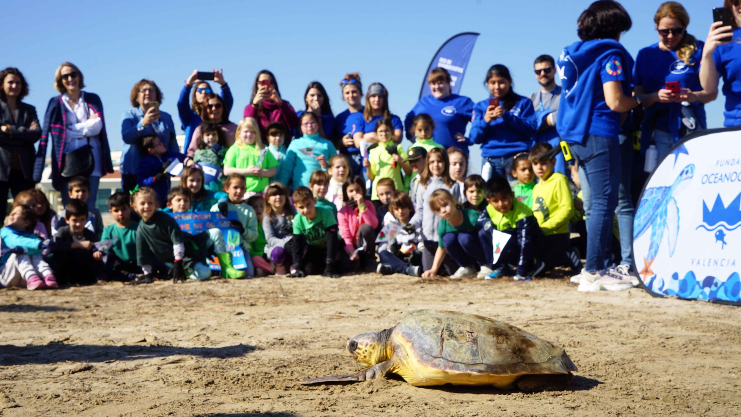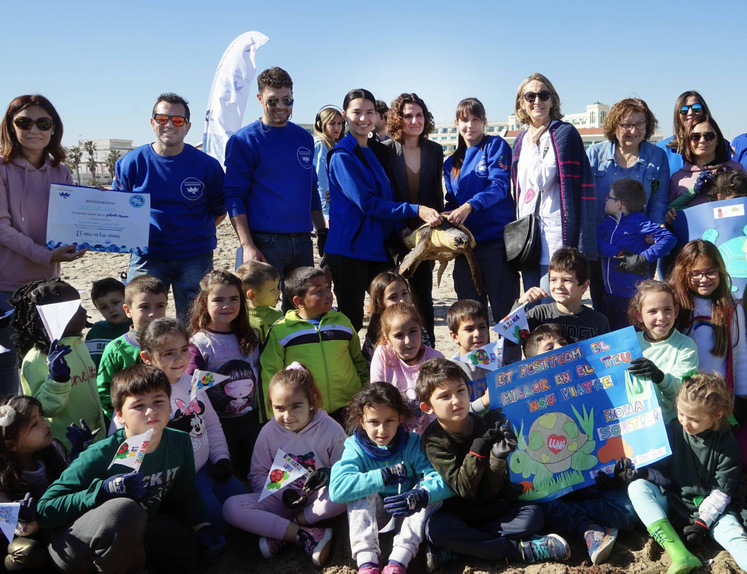Unos 75 escolares del CEIP de la Pobla de Vallbona participan en la limpieza de playa y suelta de tortuga organizada por la Fundación Oceanogràfic