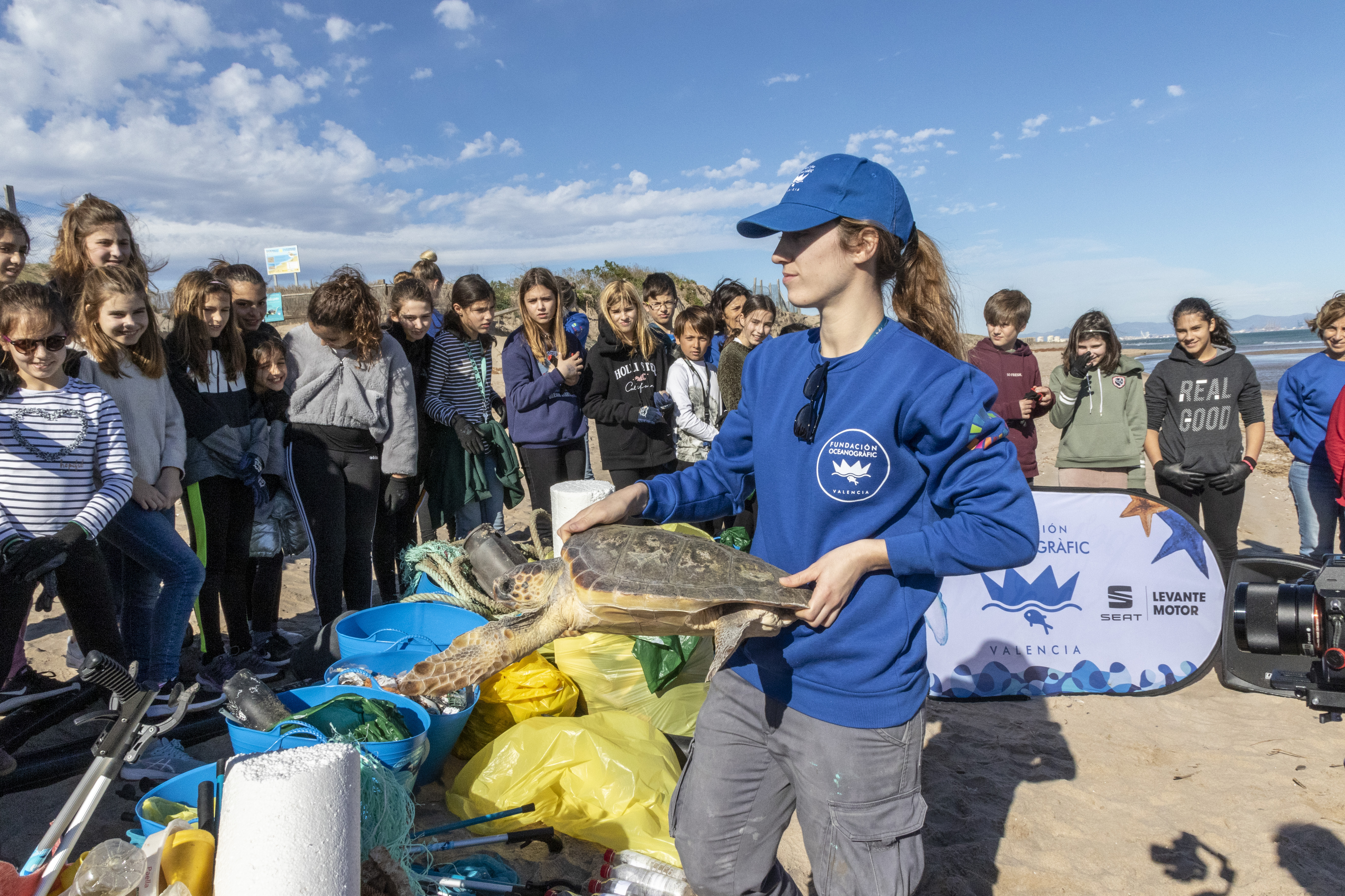Como es habitual en las limpiezas de playa organizadas por la Fundación Oceanogràfic, una vez concluida la labor y hecho el recuento de las basuras para la ficha del ministerio, se ha procedido a soltar una tortuga de las recuperadas en el ARCA del Mar del Oceanogràfic. La tortuga, numerada como 501, procedente de la pesca de arrastre de Burriana y “bautizada” por los escolares como “Mediterrani” tuvo dificultades para entrar en el mar debido al movimiento de arena tan grande experimentado en la franja de rompiente. Tras diversos esfuerzos y cambios de rumbo logró adentrarse en el mar.