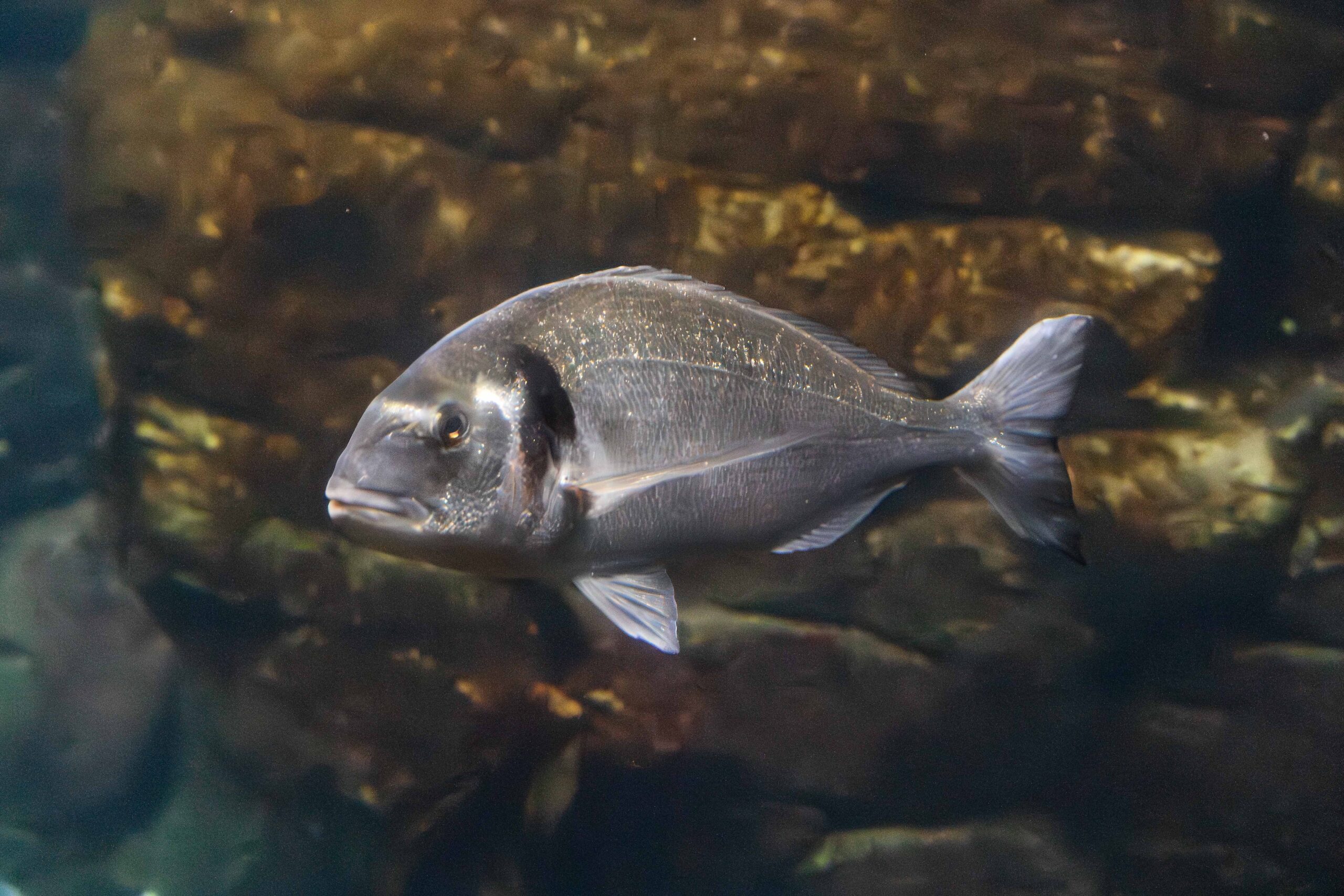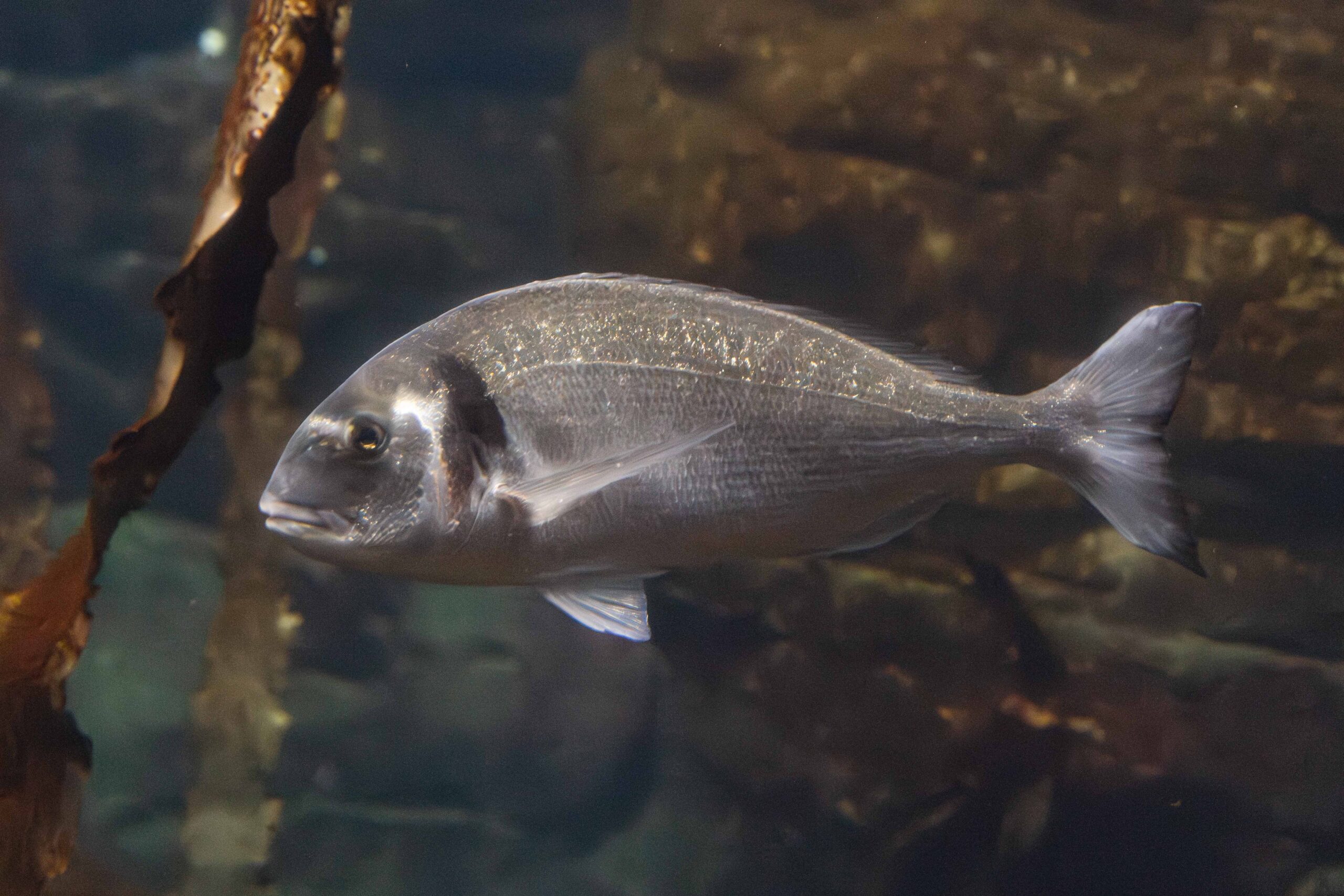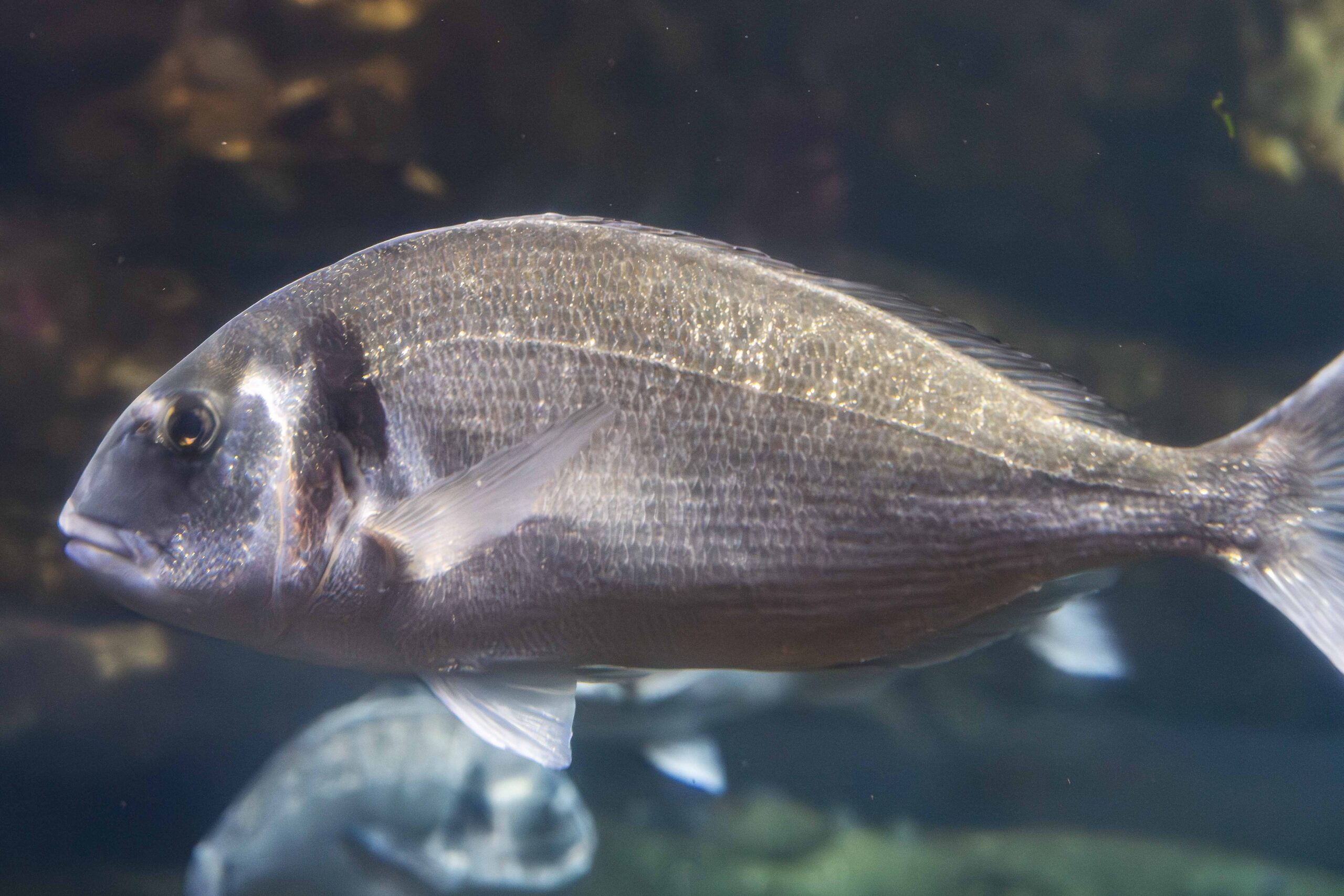 La Dorada (Sparus aurata) se reconoce fácilmente por la característica banda dorada que cruza su frente, entre los ojos. Su cuerpo es plateado y brillante, con reflejos que le permiten camuflarse perfectamente en su entorno marino.