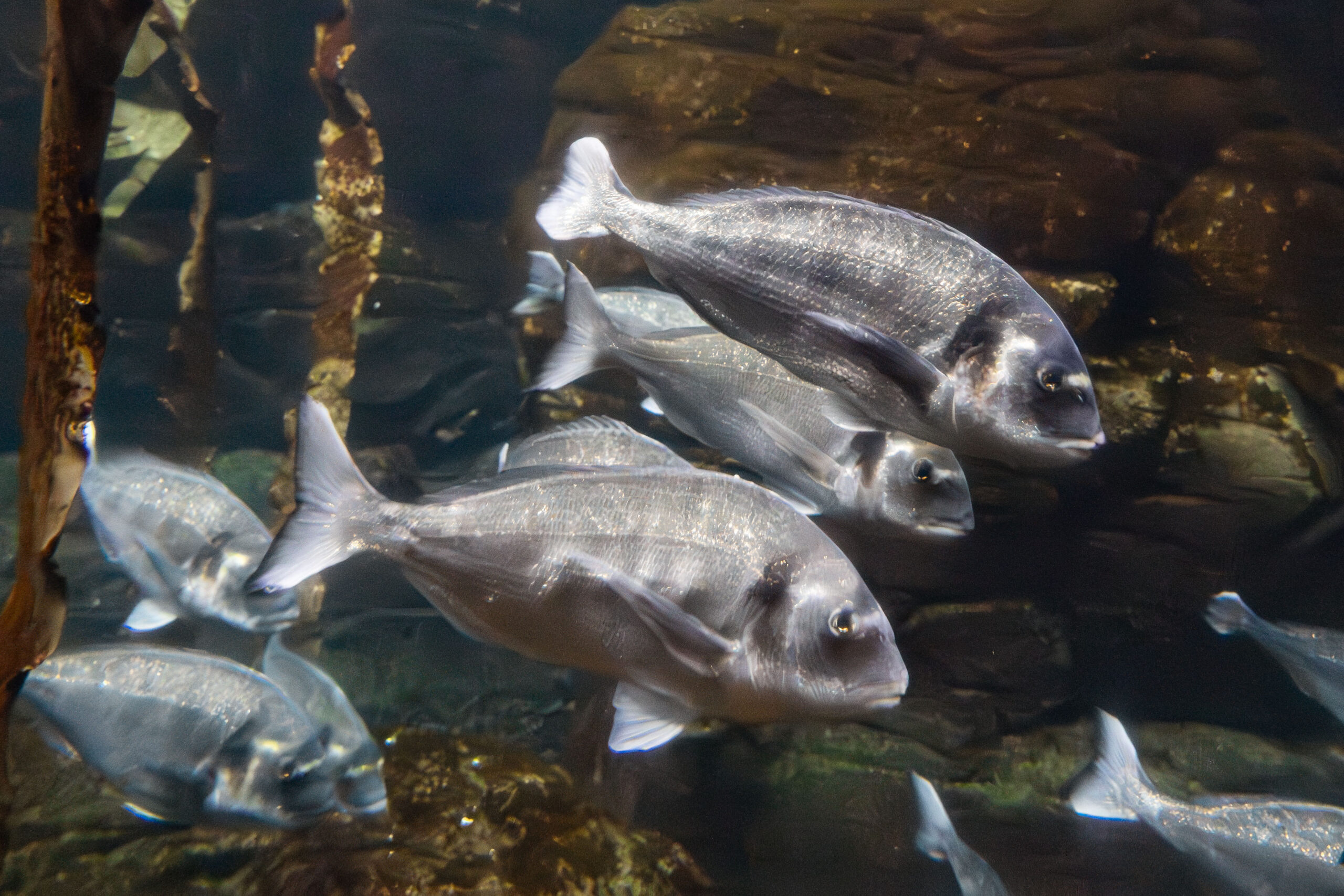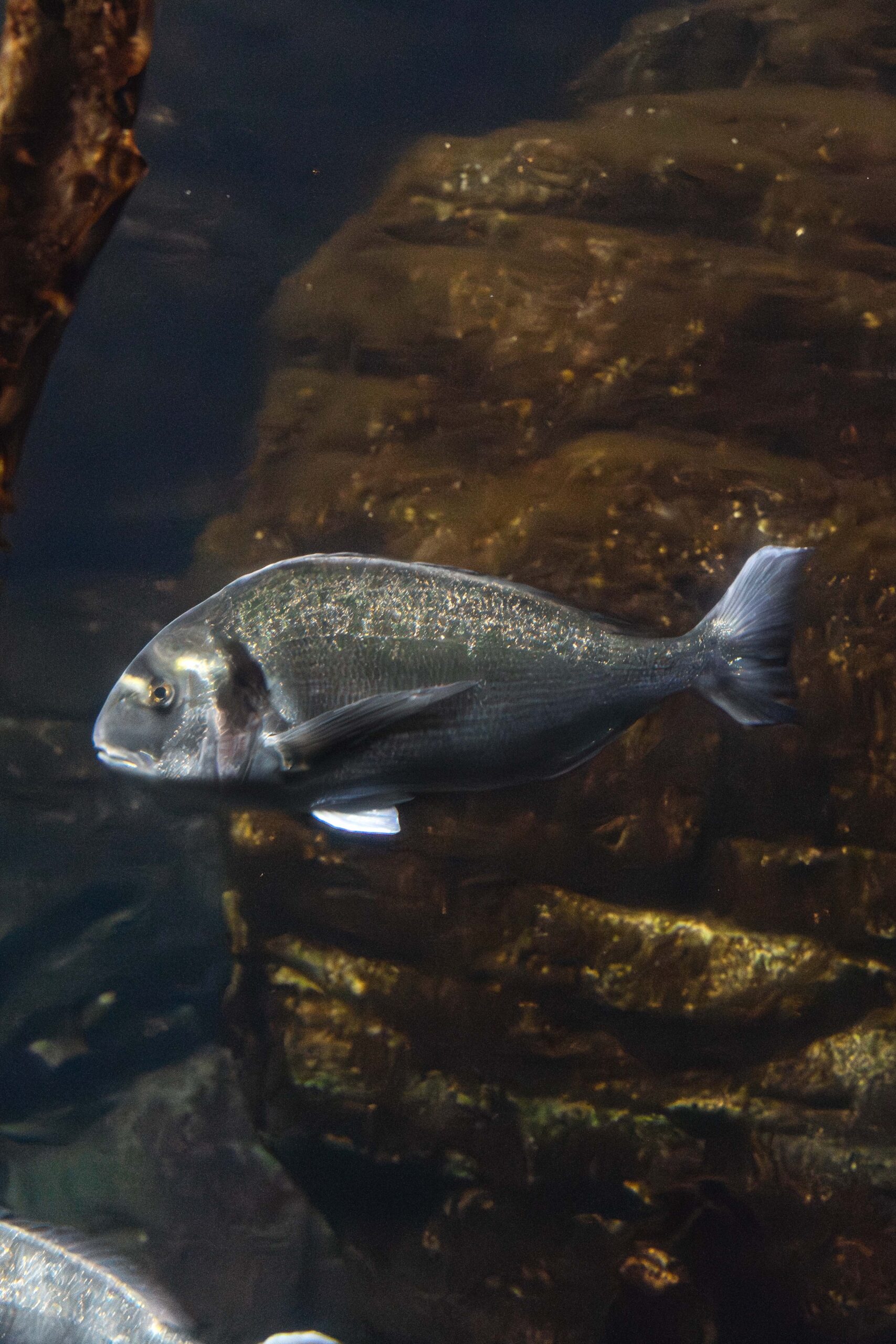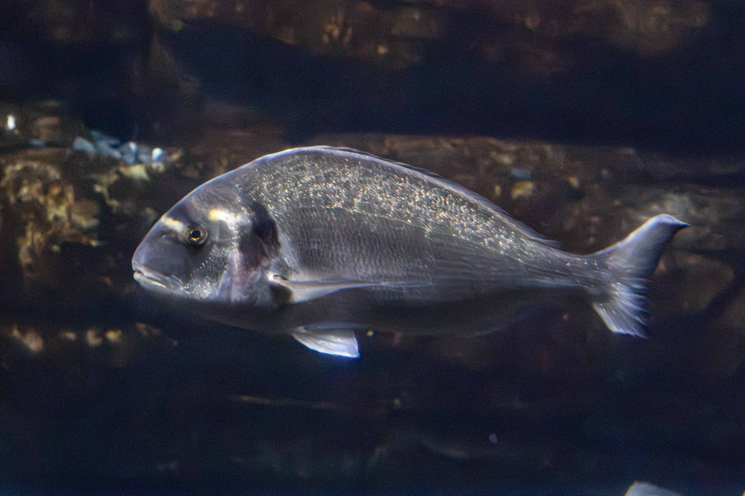 La Dorada (Sparus aurata) se reconoce fácilmente por la característica banda dorada que cruza su frente, entre los ojos. Su cuerpo es plateado y brillante, con reflejos que le permiten camuflarse perfectamente en su entorno marino.