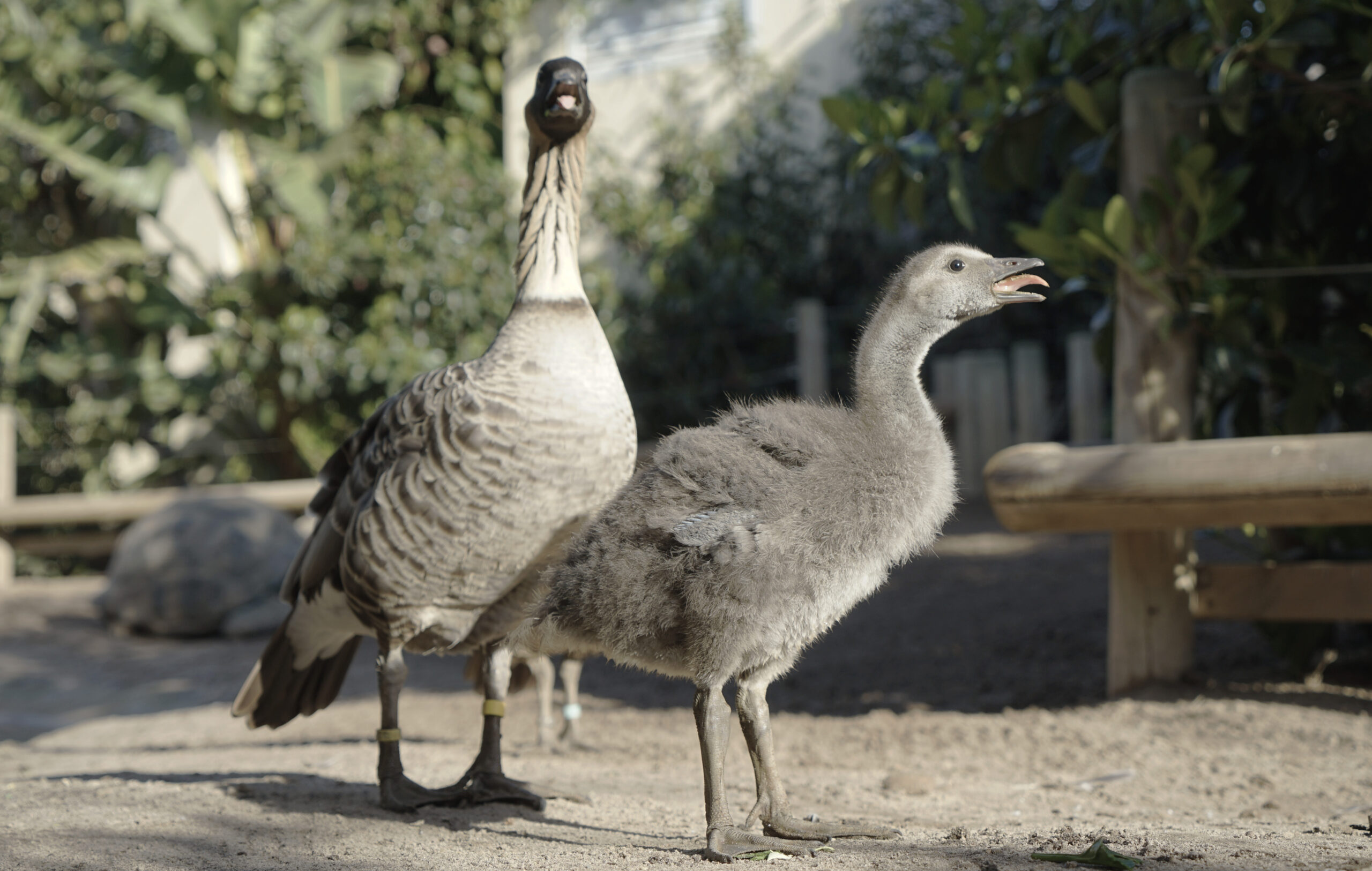 De su buena adaptación habla el hecho de que el pasado 9 de enero nació el primer ganso de Hawai bajo la atenta custodia de sus padres y el lógico alborozo de sus cuidadores, que no han dejado de atenderle, ofreciéndole todo tipo de vegetales y pienso triturado. Igualmente los padres le han enseñado a adentrase en zonas de agua y pese a su diminuto tamaño no tiene ningún temor a mezclarse entre las tortugas gigantes Aldabra (Aldabrachelys gigantea).