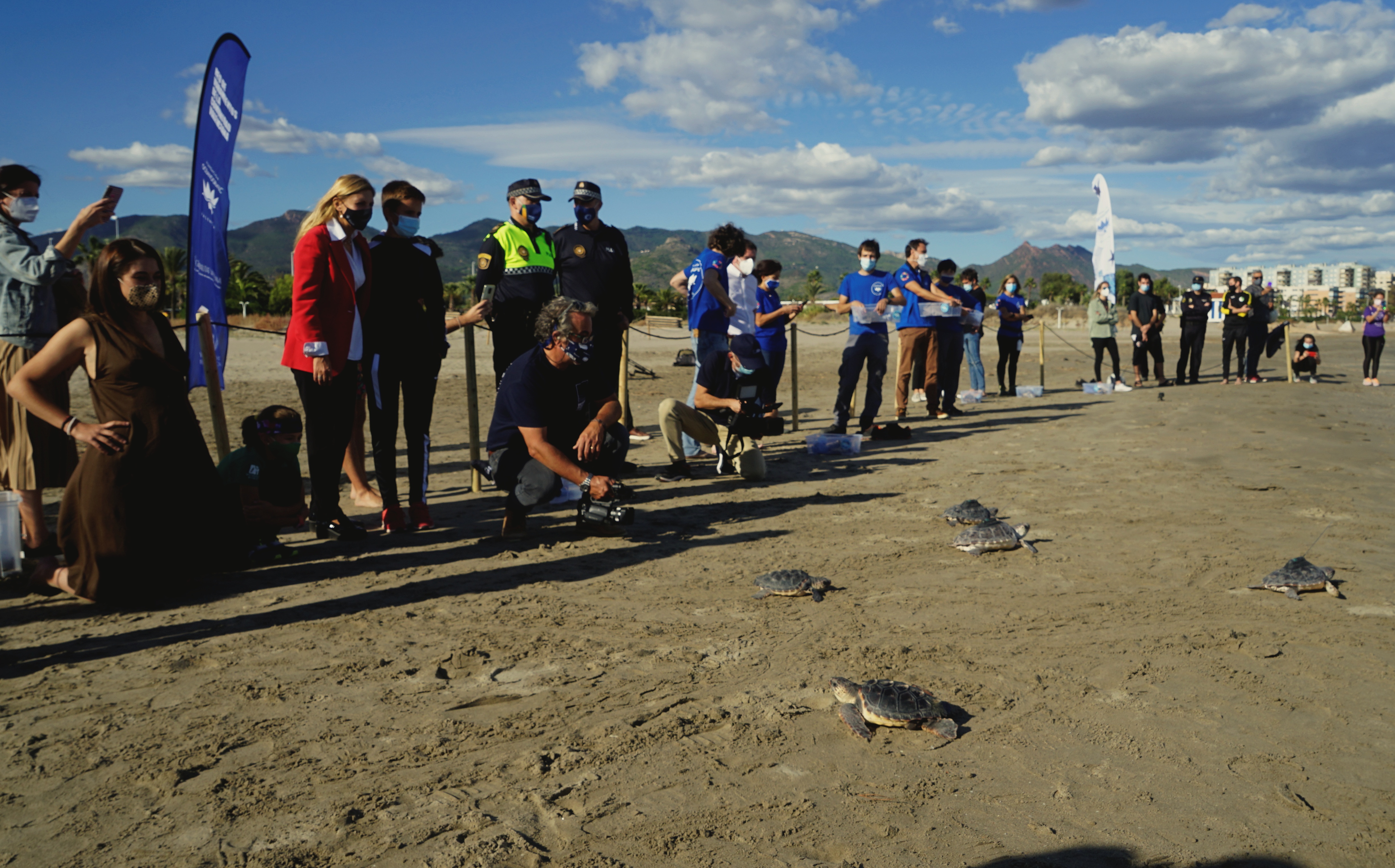 Los encargados de dejar en la arena estos jóvenes quelonios fueron la alcaldesa de Castelló, Amparo Marco, la consellera de Emergencia Climática y Transición Ecológica, Mireia Mollà, la presidenta de la Fundación Oceanogràfic, Celia Calabuig y un representante de la Policía Local que intervino en el descubrimiento del nido.