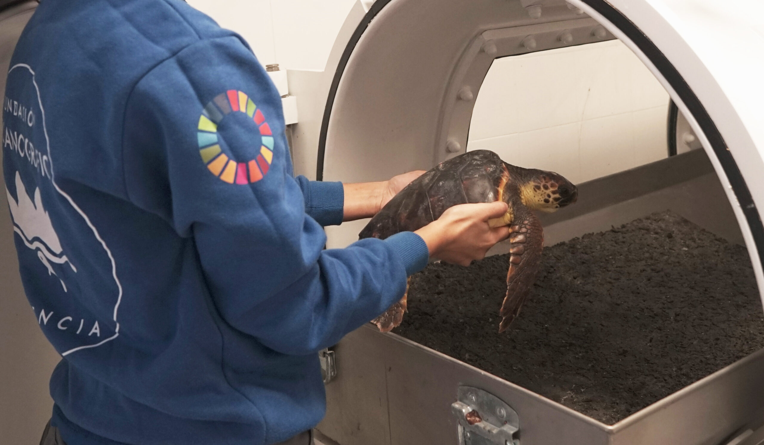 Cada año llegan al Oceanogràfic más de un centenar de tortugas marinas, que han sido capturadas de manera accidental. Los pescadores ya conocen el problema y la solución y no las devuelven inmediatamente al mar, sino que facilitan el que puedan ser tratadas en la cámara hiperbárica de la Fundación Oceanogràfic antes de ser devueltas a aguas abiertas.