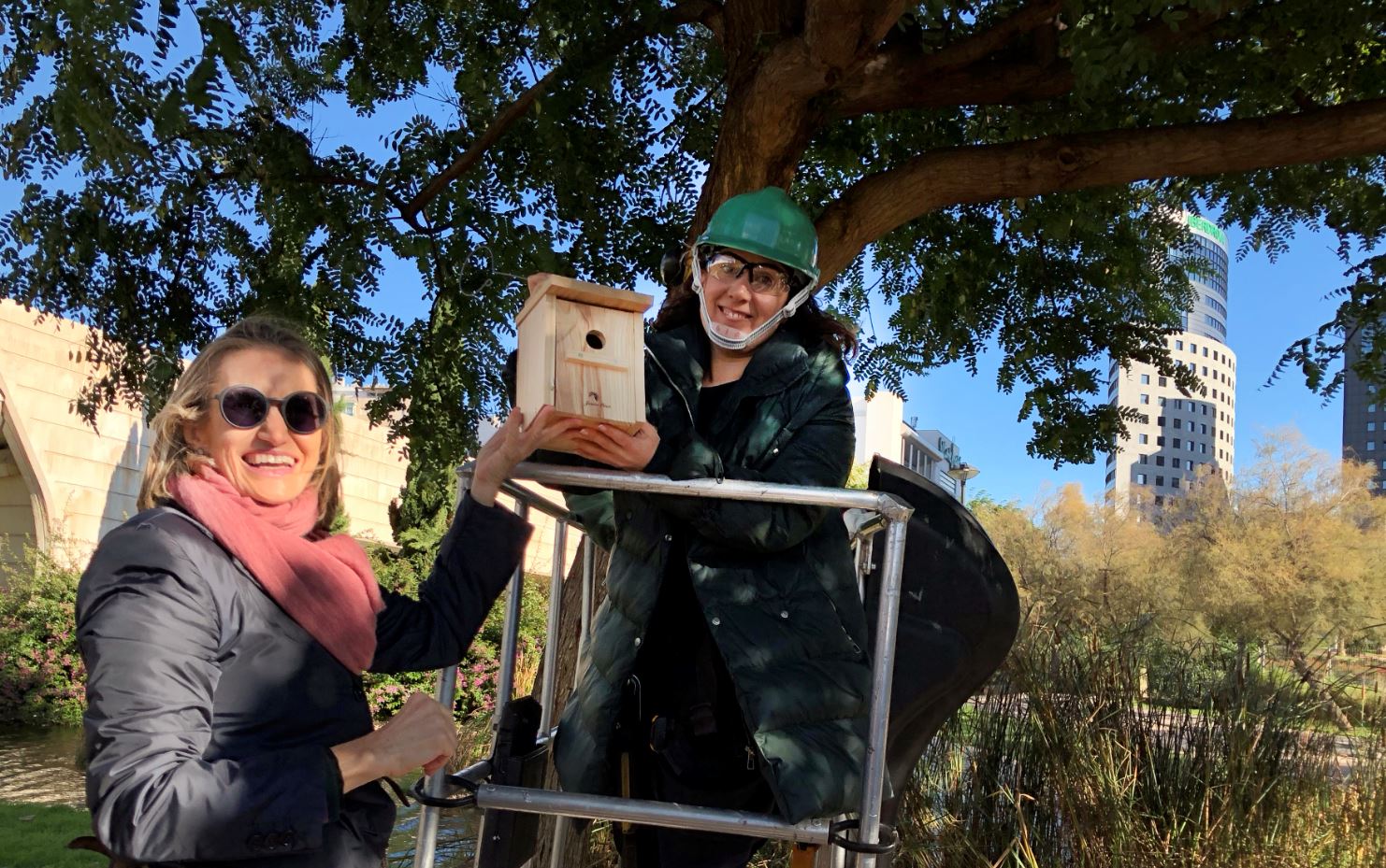 Gloria Tello y Celia Calabuig empiezan la colocación de cajas nido construidas por adultos de la Fundación Maides en colaboración con SEO Bird Life