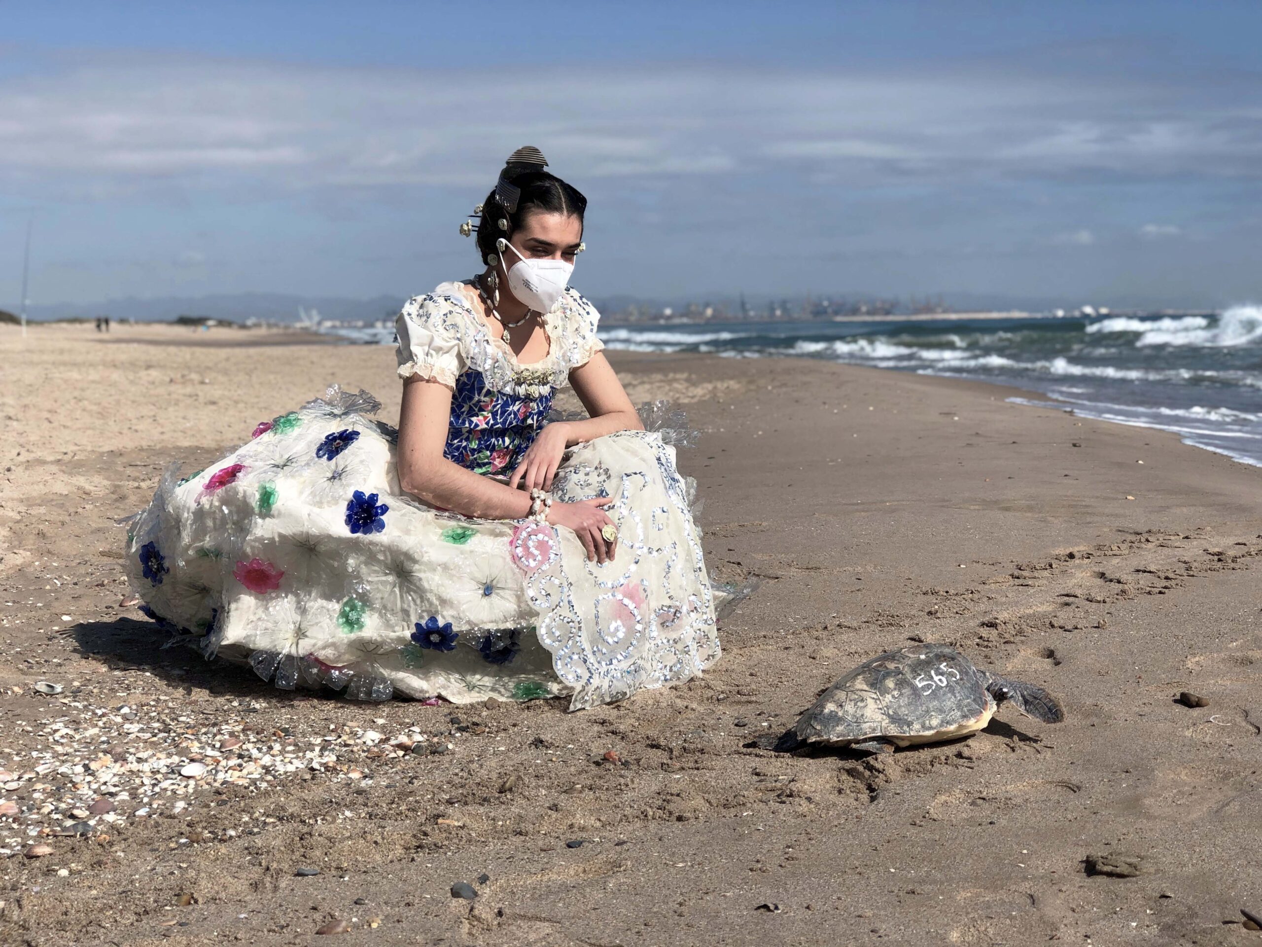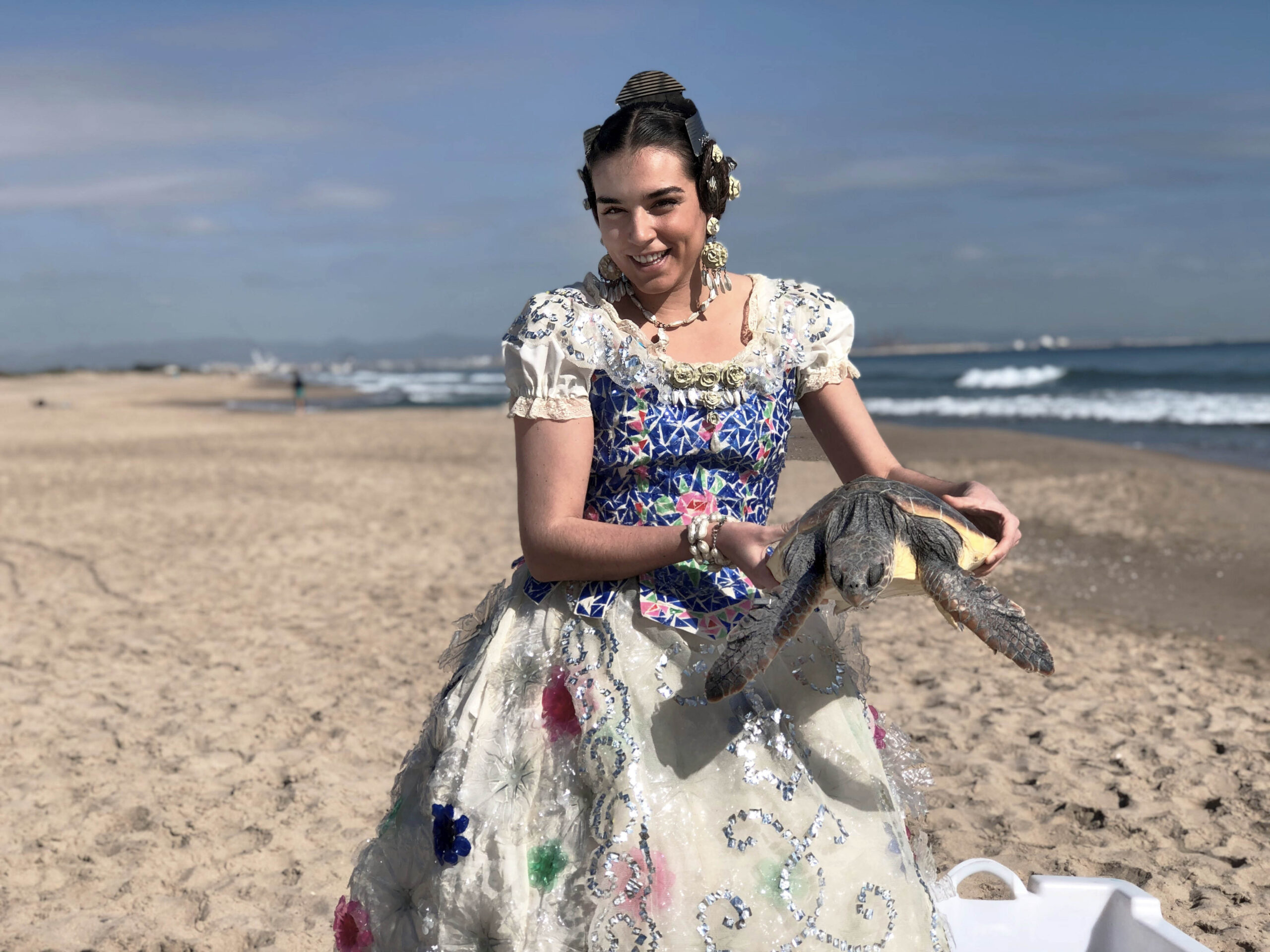 Ataviada con un espectacular vestido de fallera creado a base de productos de plástico por la artista Rosa Montesa, que representa la lucha contra la contaminación incontenible y masiva a nivel planetario de los plásticos de un solo uso, la joven Mar Lafuente reintegró al mar dos jóvenes ejemplares de tortugas bobas (Caretta caretta) capturadas accidentalmente en labores de pesca.