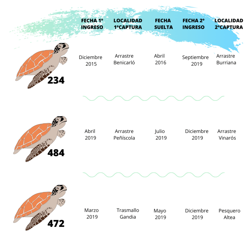 En concreto, la primera de ellas se trata de la tortuga numerada como 234, que la primera vez que entró en el Oceanográfic fue el 1 de diciembre de 2015 de un barco de arrastre en Benicarló. Se liberó cuatro meses después en el Saler. Tres años más tarde fue recogida por un arrastrero en Burriana, muy cerca del lugar donde fue capturada por primera vez. Llegó con embolia gaseosa y un anzuelo en el esófago.